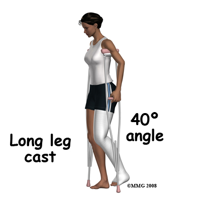 In some situations the cast can be applied without an anesthetic. The lower leg is hung over the side of the bed so that gravity keeps it straight. The cast is applied from toes to knee in this position and this splints the fracture in the reduced (straight) position. Then the leg is lifted onto the bed and the cast is continued up above the knee to form a long leg cast. The knee is bent about 40 degrees in the cast to prevent rotation and allow the leg to swing through during crutch walking.