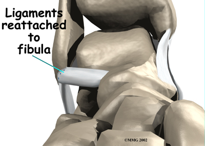 Chronic ankle instability can happen when the lateral ankle ligaments are stretched or torn and the ankle keeps giving way. Surgery can be done to tighten the stretched ligaments and improve the stability of the ankle. The surgery usually involves the ATFL and the CFL.In this procedure, an incision is made in the skin that lies over the lateral ligaments. Using a scalpel, the surgeon cuts the ATFL and CFL in half.Holes are drilled along the lower end of the fibula bone, the small bone of the lower leg. The two ends of the cut ligament are overlapped and sewn together. The surgeon uses the drill holes in the fibula to hold the stitches to the bone.A large band of connective tissue crosses the front of the ankle just below the lateral ligaments. This band, called the ankle retinaculum, holds the tendons in place. The surgeon pulls the top edge of the ankle retinaculum upward and sews it into the fibula. This helps reinforce the reconstructed ligaments.The following images show each step of the ligament tightening procedure: