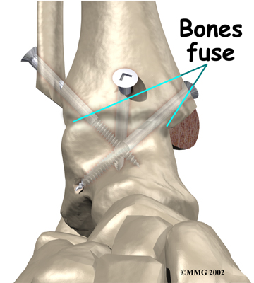 It is important when the surfaces are removed that the angles of the cut surfaces are correct. When the tibia is brought against the talus, the foot should be at a right angle to the lower leg. Once the cuts are made the bones must be held in place while they fuse. This can be done using large metal screws and metal plates if necessary. The screws are usually under the skin and are not removed unless they begin to rub and cause pain.
