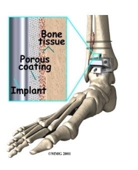 Some surgeons prefer to put the new joint in without using cement. This is called an uncemented prosthesis. The surface of this type of prosthesis bears a fine mesh of holes that allow bone to grow into the mesh and attach the prosthesis to the bone.