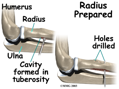 The original attachment on the radius, the radial tuberosity, is prepared. An instrument called a burr shaves off the surface of the tuberosity. The burr is then used to create a small cavity in the bone for the tendon to fit inside. Three small holes are drilled into the top of the rim of bone to secure the sutures.