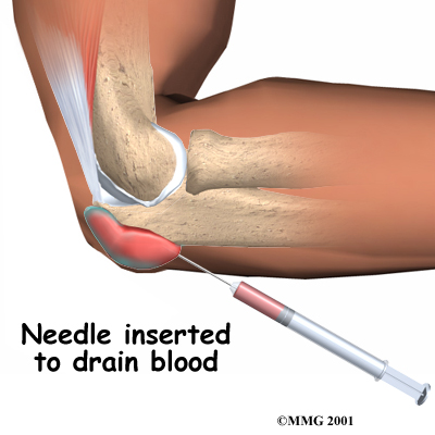 Olecranon bursitis that is caused by an injury will usually go away on its own. The body will absorb the blood in the bursa over several weeks, and the bursa should return to normal. If swelling in the bursa is causing a slow recovery, a needle may be inserted to drain the blood and speed up the process. There is a slight risk of infection in putting a needle into the bursa.
