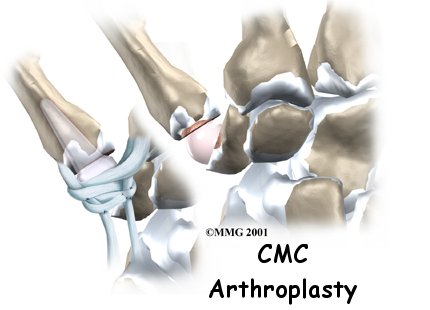 In this procedure, an incision is made across the base of the thumb. The soft tissues are spread apart with a retractor. Special care is taken not to damage the nearby nerves going to the thumb. The joint capsule is opened, exposing the CMC joint. The ends of the bones that form the CMC joint surfaces are taken off, forming flat surfaces.