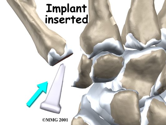 A burr is used to make a small notch, or canal, in the ends of the two bones. The surgeon shapes the notch so the ball-shaped implant will fit snugly in the joint. The implant is placed between the ends of the shaped bones.