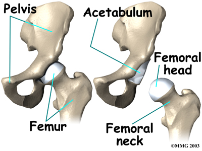 The hip socket is called the acetabulum and forms a deep cup that surrounds the ball of the upper thighbone, called the femoral head. The ball and socket is surrounded by a soft-tissue enclosure called the joint capsule.