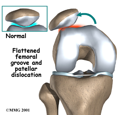 Finally, anatomic variations in the bones of the knee can occur such that one side of the femoral groove is smaller than normal. This creates a situation where the groove is too shallow, usually on the outside part of the knee. People who have a shallow groove sometimes have their patella slip sideways out of the groove, causing a patellar disclocation. This is not only painful when it occurs, but it can damage the articular cartilage underneath the patella. If this occurs repeatedly, degeneration of the patellofemoral joint occurs fairly rapidly.