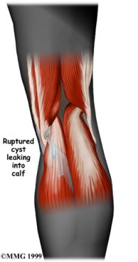 Sometimes a cyst will suddenly burst underneath the skin, causing pain and swelling in the calf. A ruptured popliteal cyst gives symptoms just like those of a blood clot in the leg, called thrombophlebitis. For this reason, it is important to determine right away the cause of the pain and swelling in the calf. Once the cyst ruptures, the fluid inside the cyst simply leaks into the calf and is absorbed by the body. In this case, you will no longer be able to see or feel the cyst. However, the cyst will probably return in a short time.