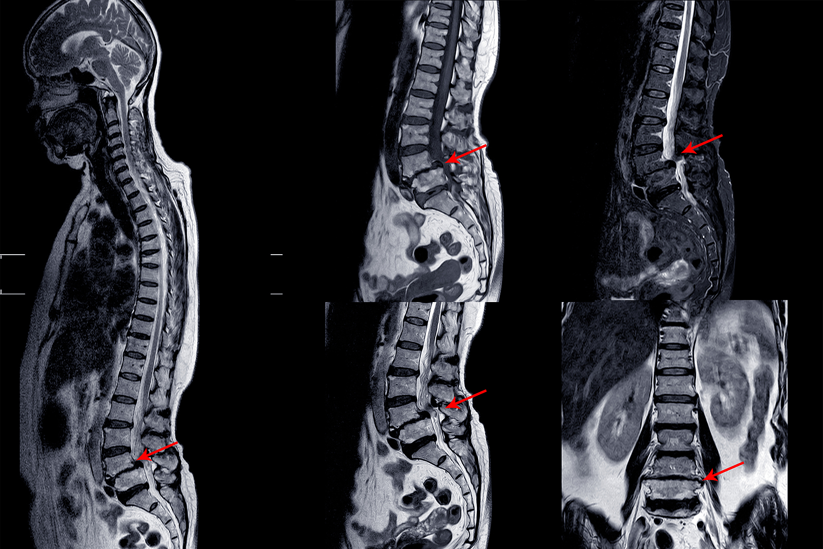 An MRI scan uses magnetic waves (not radiation) to create pictures of the lumbar spine in sections called slices. The MRI scan shows the bones in the lumbar spine as well as soft tissue structures such as the discs, joints, and nerves. MRI scans are painless and don’t subject you to radiation as an x-ray does. MRI scans are the most common test for visualizing the lumbar spine after an x-ray has been taken. These tests may be recommended if your health care provider is concerned that surgery may be necessary.