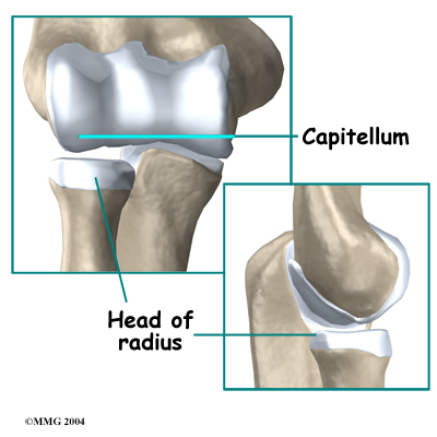 The elbow itself is essentially a hinge joint, meaning it bends and straightens like a hinge. But there is a second joint where the end of the radius (the radial head) meets the humerus. The knob on the end of the humerus is called the capitellum. The capitellum fits into the cup-shaped end of the radius, also called the head of the radius, or radial head. This joint is complicated because the radius has to rotate so that you can turn your hand palm up and palm down. At the same time, it has to slide against the end of the humerus as the elbow bends and straightens. The joint is even more complex because the radius has to slide against the ulna as it rotates the wrist as well.