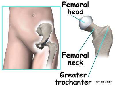 The hip joint is where the thighbone (femur) connects to the pelvis. The joint is made up of two parts. The upper end of the femur is shaped like a ball. It is called the femoral head. The femoral head fits into a socket in the pelvis called the acetabulum. This ball and socket joint is what allows us to move our leg in many directions in relation to our body.