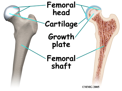 In the growing child, there are special structures at the end of most bones called growth plates. The growth plate is sandwiched between two special areas of the bone called the epiphysis and the metaphysis. The growth plate is made of a special type of cartilage that builds bone on top of the end of the metaphysis and lengthens the bone as we grow. In the hip joint, the femoral head is one of the epiphyses of the femur.