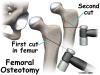 Realignment of the femur is called a femoral osteotomy. This procedure changes the angle of the femoral neck so that the femoral head points more towards the socket. To perform this procedure, an incision is made in the side of the thigh. The bone of the femur is cut and realigned in a new position. A large metal plate and screws are then inserted to hold the bones in the new position until the bone has healed. The plate and screws may need to be removed once the bone has healed.
