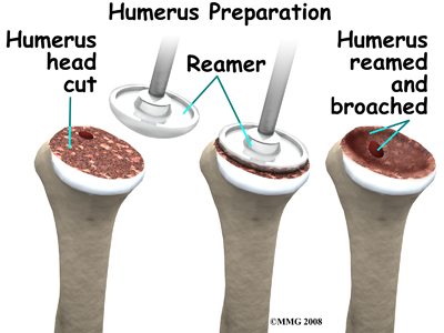 During the surgery, the humerus is prepared by cutting off the deformed humeral head and reaming the canal to allow for insertion of the humeral stem. The glenoid is reamed to create a bone tunnel, and flattened to seat the glenoid base plate. In patients with weak bone, fractures can occur during this part of the procedure that may require restricted activity after the surgery while the fracture heals.